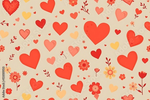 Hearts and Flowers Seamless Pattern: A whimsical and charming pattern featuring a delicate arrangement of red hearts and colorful flowers, perfect for crafting, scrapbooking.