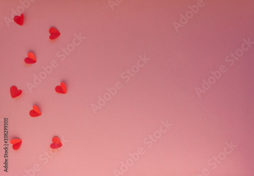 Hearts on a pink background. Valentin's Day, top view. Copy space. Flat lay. Greeting card.