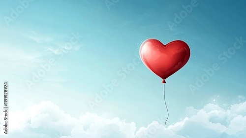 Heart-shaped balloon floats amongst fluffy clouds on a clear blue sky during a bright sunny day
