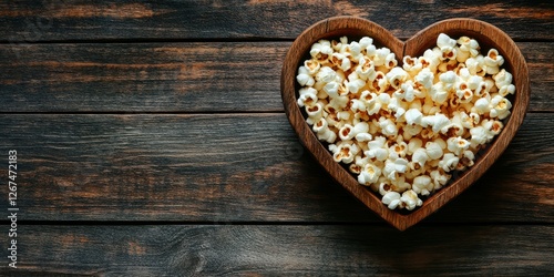 Heart-shaped bowl filled with fresh popcorn resting on a rustic wooden table