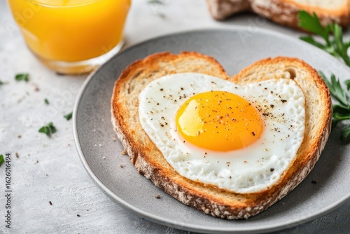 Heart-Shaped Egg Toast Delight: A heartwarming image of a sunny-side-up egg, nestled within a heart-shaped toast slice, served with fresh orange juice, perfect for a delightful and healthy breakfast.