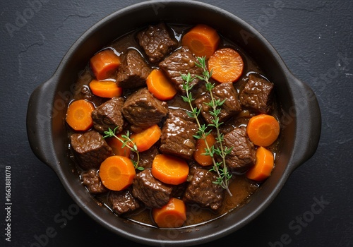 Hearty Beef and Carrot Stew with Thyme Garnish in a Rustic Black Pot, Top-Down View on Slate.