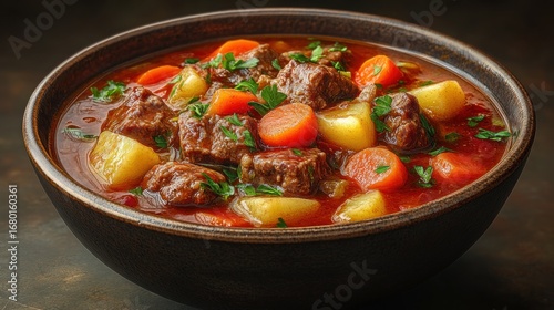 Hearty Beef and Vegetable Stew with Tender Meat, Potatoes, and Carrots, Garnished with Fresh Parsley in a Rustic Ceramic Bowl