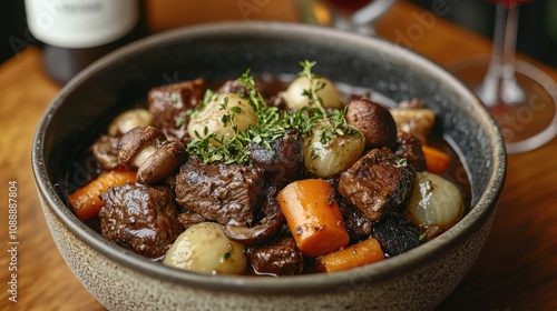 hearty Beef Bourguignon with tender beef, carrots, onions, and mushrooms, garnished with fresh thyme, perfect for comforting meal