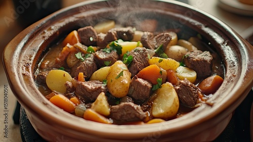 Hearty Beef Stew in a Traditional Clay Pot Surrounded by Fresh Vegetables with Steam Rising in a Cozy Kitchen Setting