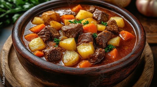 Hearty beef stew simmering with vegetables and spices in a rustic wooden bowl on a wooden table