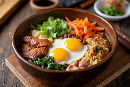 Hearty bowl of ramen, featuring fried eggs, sauteed pork, and an assortment of vegetables atop a bed of noodles. The bowl is well-balanced with textures and colors.