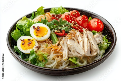 Hearty nan gyi thoke featuring thick rice noodles, chicken, boiled eggs, vegetables, and spices beautifully arranged on a white background