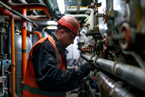 Heating technician diligently performing maintenance tasks in a boiler room to ensure proper functionality of the heating system