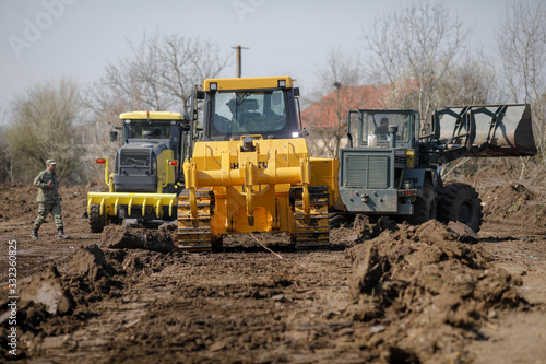 Heavy machinery of the Romanian Army level the ground for a campaign mobile hospital (ROL 2) to treat Covid-19 patients.