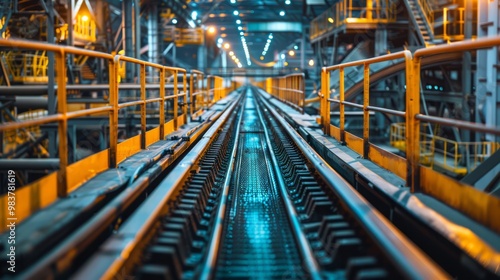 Heavy machinery operating in conjunction with conveyor belts in a large industrial environment, highlighting advanced technology