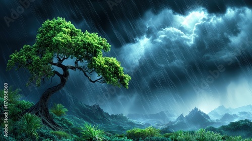 Heavy rain laden clouds, their undersides a menacing dark gray, pressing down on a landscape where wind whips through trees and vegetation.