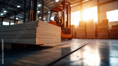 Heavy-duty particleboard sheets neatly loaded on a forklift, with sunlight streaming through warehouse windows, adding depth to the industrial setting.