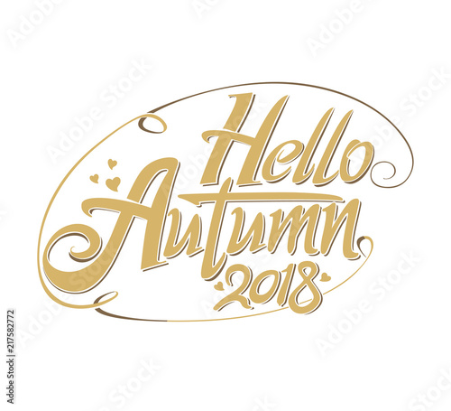 Hello Autumn. 2018. Vignette seasonal symbol welcome label. Vector template isolated on white background.