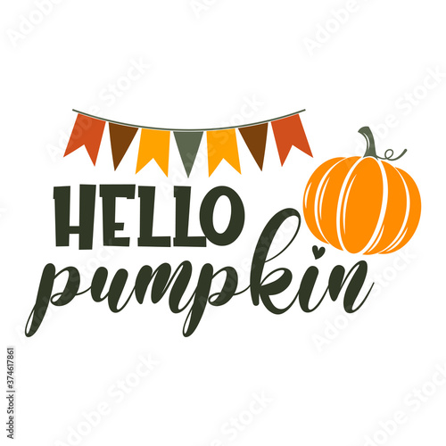 Hello pumpkin slogan inscription. Vector quotes. Illustration for Thanksgiving for prints on t-shirts and bags, posters, cards. Isolated on white background. Thanksgiving phrase, Hello fall.