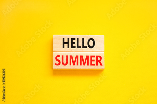 Hello summer symbol. Concept words Hello summer on beautiful wooden block. Beautiful yellow paper background. Business lifestyle Hello summer concept. Copy space.