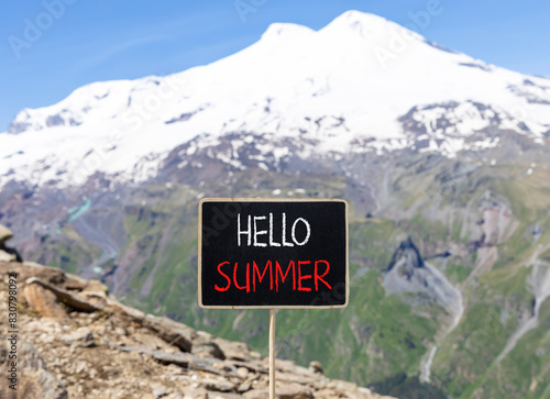 Hello summer symbol. Concept words Hello summer on beautiful yellow blackboard. Beautiful mountain Elbrus background. Business lifestyle Hello summer concept. Copy space.