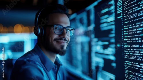Helpdesk technician surrounded by floating data streams, abstract visual, tech support