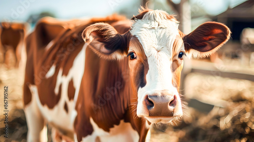 Herd of dairy cows grazing peacefully on a lush green pasture in a picturesque farm landscape The cows are part of a working cattle ranch or dairy farm