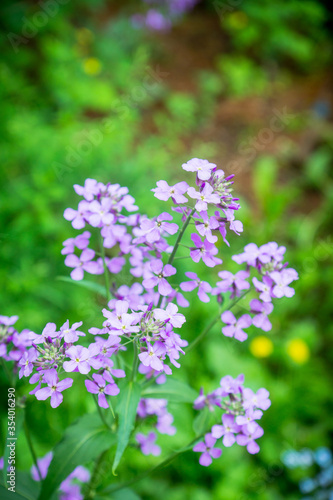 Hesperis matrolnalis flowers blooming in the garden. Selective focus. Shallow depth of field.