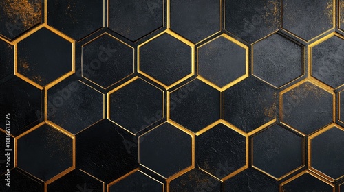 Hexagon grid with metallic gold outlines on a black background, creating a luxurious and elegant feel