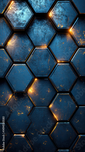 Hexagon Mosaic: A macro view of textured hexagon mosaic, featuring a captivating array of blues, and radiant hints of gold, offering a dynamic display of geometry.