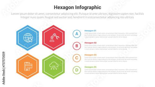 hexagon or hexagonal honeycombs shape infographics template diagram with square shape structure with 4 point step creative design for slide presentation