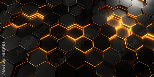 Hexagon steel pattern, abstract seamless background, gold lights, vibrating and blury background, Generative AI
