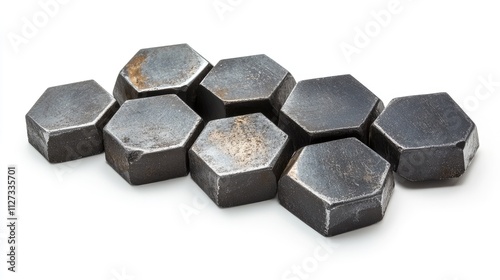 Hexagonal iron heads coated with zinc arranged on a white background showcasing industrial material texture and design