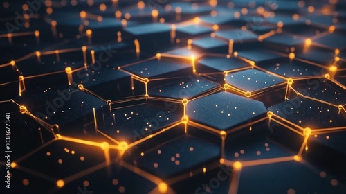 Hexagonal network technology background with a connected grid of glowing hexagons.