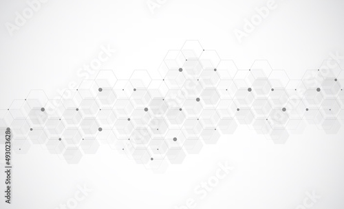Hexagons pattern on gray background. Genetic research, molecular structure. Chemical engineering. Concept of innovation technology. Used for design healthcare, science and medicine background