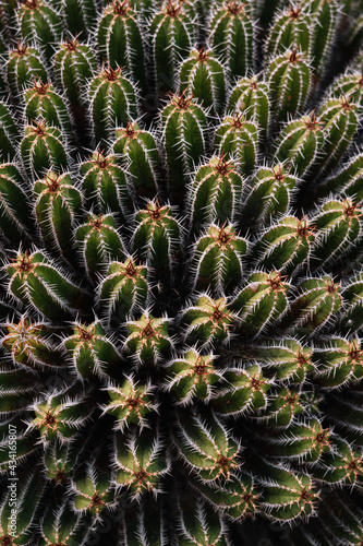 High angle green Echinopsis pachanoi cacti with sharp prickles growing on plantation in daylight