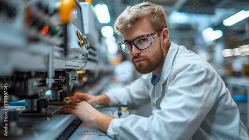High angle view, in a clean modern factory, engineers working on high tech machines,generative ai