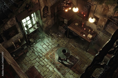 High angle view of a miniature alchemist's room, featuring a cobblestone floor, vintage furniture, and soft lighting from hanging lamps and candles, creating a mysterious atmosphere