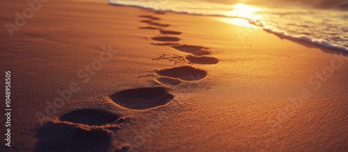High angle view of footprints on a sandy beach at the shore at sunset with copy space Unmodified brown identity trail textured nature and vacation theme