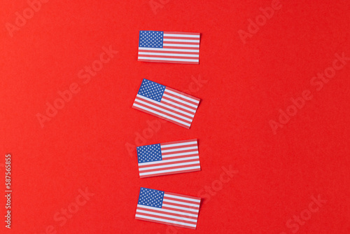 High angle view of four flags of united states of america with copy space on red background