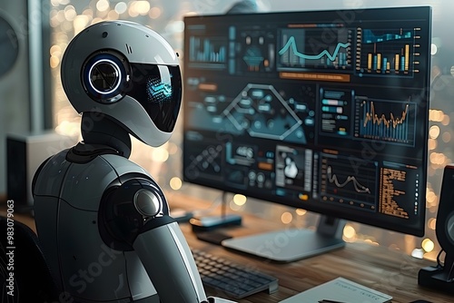 High Angle View Of Notepad Showing Digital Marketing Diagram On Wooden Desk With Humanoid Robot