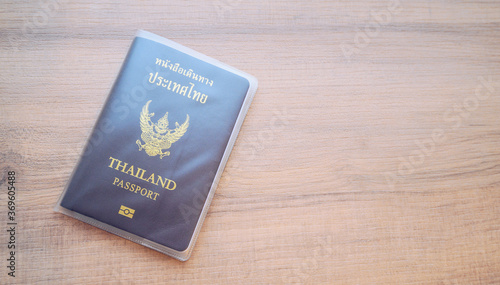 High angle view of Thailand passport on wooden table with empty copyspace.