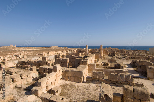 High angle view of the ruins of buildings in an ancient Roman city, Sabratha, Tripolitania, Libya