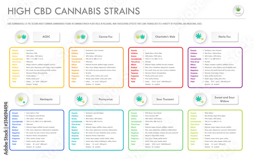 High CBD Cannabis horizontal business infographic illustration about cannabis as herbal alternative medicine and chemical therapy, healthcare and medical science vector.
