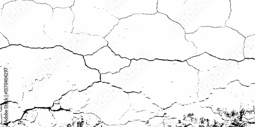 high contrast black and white image of a cracked white wall with cracks and damaged texture, creating an abstract and distressed background look