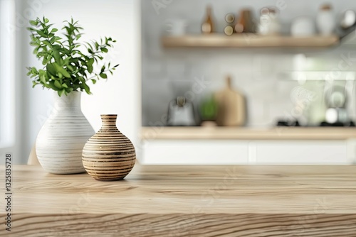 high definition image of Wooden table with modern vases in blurred Scandinavian kitchen