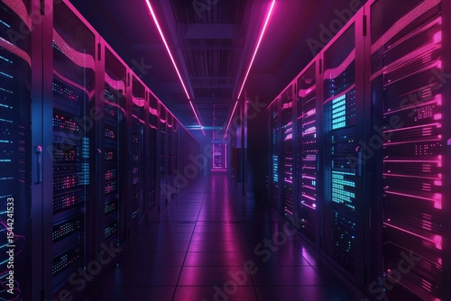 High Detail Image of Corridor in Active Data Center with Supercomputers