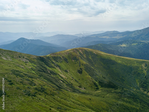 High mountains of the Ukrainian Carpathians in cloudy weather. Aerial drone view.