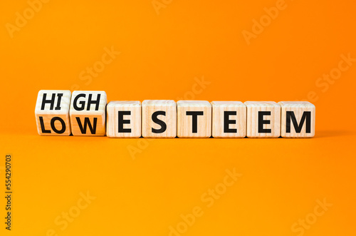 High or low esteem symbol. Concept words High esteem and Low esteem on wooden cubes. Beautiful orange table orange background. Business high or low esteem concept. Copy space.