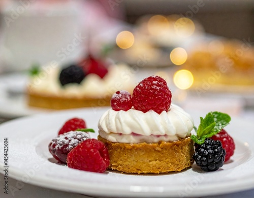 High quality image of a nicely decorated dessert with powdered sugar and berries.