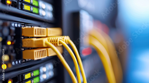 High quality network equipment with yellow cables connected to server, showcasing modern technology and connectivity