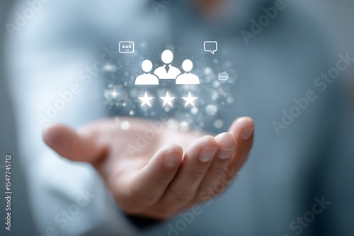 High quality photo of person holding out their hand with an icon of three stars and two people in it, indicating customer reviews on a mobile phone screen. The background is blurred.