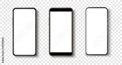 High quality realistic trendy no frame smartphone with blank white screen. Mockup phone for visual ui app demonstration. Vector mobile set device concept. Detailed Mockup Smartphone