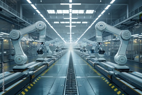 High res ai robotic arms in manufacturing plant, engineer s perspective in bright production line